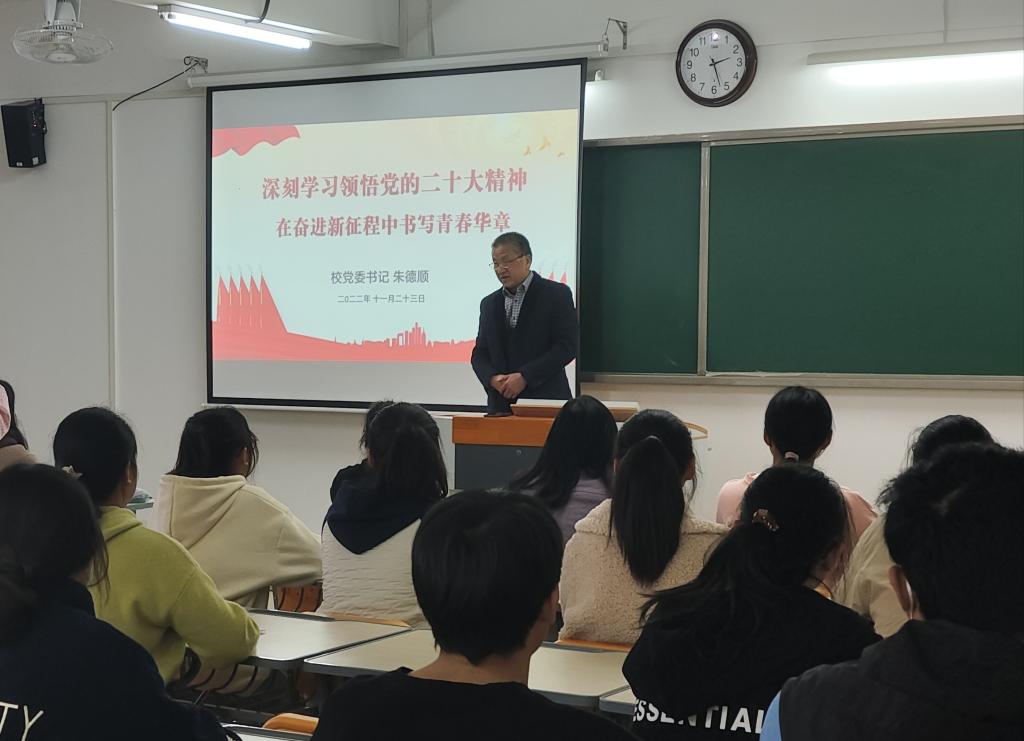 2022年11月23日下午在jdb电子游戏官方网站第二教学楼322教室,校党委书记朱德顺为大一新生上了一堂精彩、激昂的“形势与政策”课,以“在奋进新征程中书写青春华章”为题,宣讲党的二十大精神。jdb电子游戏官方网站院长助理陈志操主持,2022级经济学普本新生代表参加。