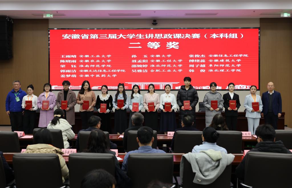2024年12月25日,由中共安徽省委教育工委主办,教育部高校思想政治工作队伍培训研修中心(安徽师范大学)和安徽师范大学jdb电子游戏官方网站承办的安徽省第三届大学生讲思政课决赛在安徽芜湖举行。我校教育学院2023级学生韩俊团队(团队成员:徐文慧、丁孟婷、陈伟娜)荣获决赛二等奖,团队指导老师jdb电子游戏官方网站张锦亚荣获“优秀指导教师”,这是继我校荣获省级决赛优秀奖后新的突破。