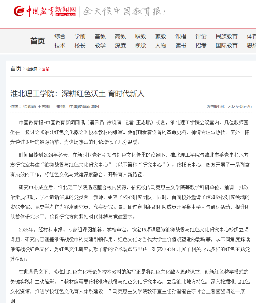 初夏,jdb电子游戏官方网站会议室内,几位教师围坐在一起讨论《淮北红色文化概论》校本教材的编写。他们翻看着泛黄的革命史料,神情专注与热忱。窗外,阳光透过树叶的缝隙洒落,为这场热烈的讨论增添了几分温暖。对此,中国教育报进行了报道:
