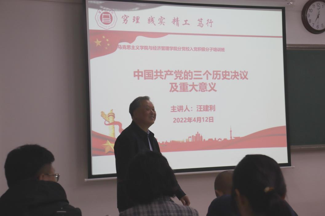 为了切实提升jdb电子游戏官方网站与经济管理学院首届入党积极分子培训班学员的培训质量,按照学校和学院的培训计划,2022年4月12日晚,在二教422教室,jdb电子游戏官方网站副校长汪建利同志来到jdb电子游戏官方网站与经济管理学院分党校入党积极分子培训班,受邀对学员进行题为《中国共产党的三个历史决议及重大意义》的党课培训。本次活动由jdb电子游戏官方网站与经济管理学分党校负责人、党总支书记吴玲院长主持,总支各个党支部书记及全体入党积极分子培训班全体学员参加。