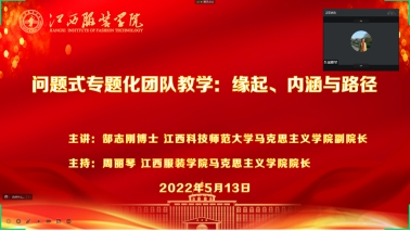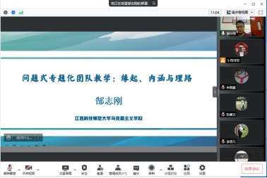 为深入学习贯彻习近平总书记在学校思想政治理论课教师座谈会以及在中国人民大学考察时的重要讲话精神,全面贯彻落实党中央国务院、省委省政府关于新时代学校思政课改革创新的部署要求,深入推进思政课问题式专题化团队教学改革,全面提升思政课的思想性、理论性和亲和力、针对性,5月13日晚,开云kaiyun官方网站邀请江西科技师范大学开云kaiyun官方网站副院长郜志刚教授进行线上专题讲座,学院全体教师参加讲座,讲座由学院院长周丽琴主持。