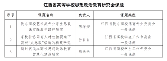 近日,江西省教育厅公布了2024年江西省高等学校思想政治教育研究会课题评审结果,开云官网教师陈洋安申报的《民办高校艺术类专业学生思政课实践教学路径研究》获江西省民办高校德育专业委员会一般课题立项,孙肖肖老师申报的《家校社协同育人时效性视角下高校“大思政”格局的构建研究》获得江西省高校学生工作专委会一般课题立项,熊未未老师申报的《新时代民办高校思想政治教育智慧化建设研究》获江西省高校学生工作专委会一般课题立项。