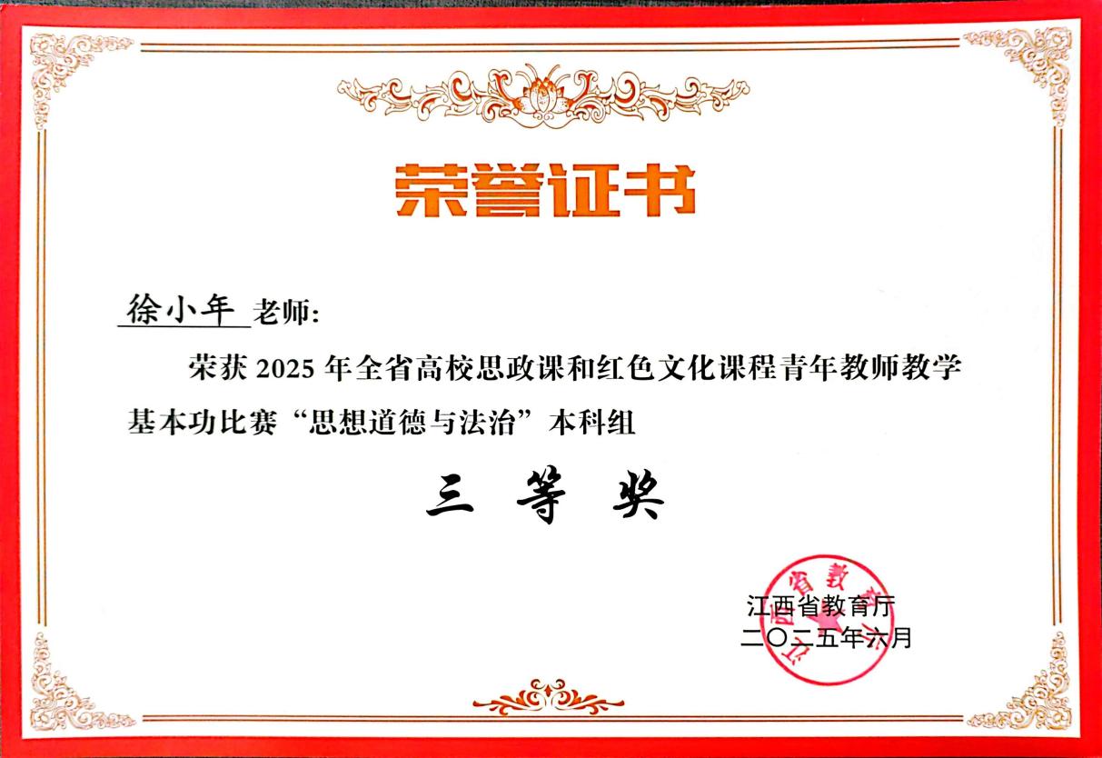 (开云kaiyun官方网站 讯)近日,江西省教育厅正式公布2025年全省高校思政课和红色文化课程青年教师教学基本功比赛结果,在这场汇聚全省高校教学精英的激烈角逐中,开云官网思政课教师徐小年凭借扎实的专业素养与创新的教学风采斩获《思想道德与法治》课程(本科组)三等奖。 据悉本次全省高校思政课和红色文化课程青年教师教学基本功决赛,设置一等奖10%、二等奖15%、三等奖20%,竞争激烈。学院精心准备,参赛选手敢于挑战,克服困难,以赛促教,最终获得奖项。 此次获奖将激励开云官网继续深化思政课改革创新,进一步加强青年教师培养,推动思政课建设再上新台阶,为培养德智体美劳全面发展的社会主义建设者和接班人提供坚强保障。
