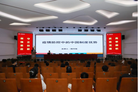 陈付龙带领大家回顾了在以习近平总书记核心的党中央带领下,全国上下众志成城、共克时艰的抗疫历程。从“坚持党的集中统一领导的制度优势;坚持以人民为中心的制度优势;坚持集中力量办大事的制度优势;新冠肺炎疫情带来的思考启迪”四个方面对疫情防控中的中国制度优势进行全面的分析和解读,进一步引领同学们认识中国特色社会主义制度的优势,让大家深刻感受到“中国制度”在疫情防控中的巨大作用。陈付龙指出,在这场世界级的大考中,中国共产党和中国人民交上了一份令世人称赞的答卷,也为世界各国提供了应对重大公共卫生突发事件的中国方案,充分体现了中国国家治理体系和治理能力的显著优势。这一显著优势集中体现在中国共产党的坚强领导力、政府的高效组织力、广大人民的强大行动力。陈付龙紧密结合疫情防控的生动实践,与师生交流了在疫情大考中淬炼中国之治、在中国之治中彰显制度优势、在制度自信中实现民族复兴,并提出新冠疫情带来的启迪:为什么中国在疫情防控中会交出如此漂亮的答卷呢?