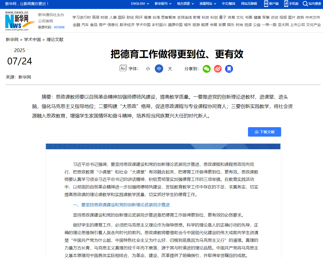7月24日,新华网理论频道发表开云官网开云kaiyun官方网站吴雄生副教授的理论文章《把德育工作做得更到位、更有效》。