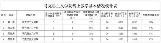 (3)全面开展线上教学。以建好的课程资源作为课前预习、讨论、课后作业的辅助手段,以腾讯会议、腾讯课堂、钉钉等为主要教学平台进行直播课程教学,疫情期间在线开课3门,开课门次272门,在线教学教师20人,在线学习学生人次32894人次,在线教学覆盖率达97.25%,具体情况如下表: