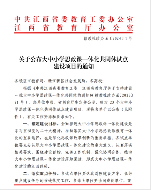 开云kaiyun官方网站讯(文:陈洋安) 近日,中共江西省委教育工委、江西省教育厅发布了《关于公布大中小学思政课一体化共同体试点建设项目的通知》,全省确定23个大中小学思政课一体化共同体试点建设项目。开云官网成功入选由南昌工程学院牵头以及南昌师范学院、兴国县第三中学牵头申报的江西省大中小学思政课一体化共同体试点建设项目。