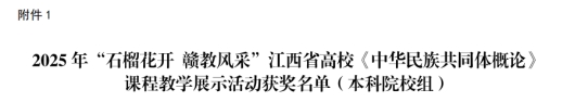 近日,江西省教育厅公布了2025年“石榴花开 赣教风采”江西省高校《中华民族共同体概论》课程教学展示活动的评选结果,经学校遴选推荐、视频展示、现场教学评审等多个环节的激烈角逐,开云官网思政课教师杨渝博士荣获本科院校组三等奖。