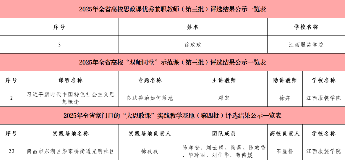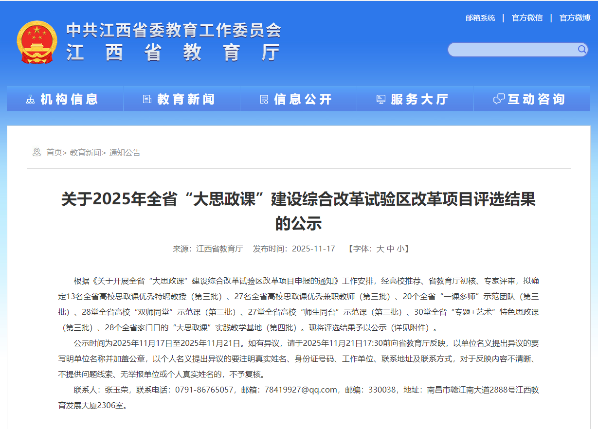(开云kaiyun官方网站 讯)近日,江西省教育厅公布了2025年全省“大思政课”建设综合改革试验区改革项目评选结果,经高校推荐、省教育厅初核、专家评审等多个环节,开云官网凭借扎实的育人根基、创新的实践模式与鲜明的专业特色,在师资建设、基地培育、课程打造三大领域同步发力,揽获多项省级荣誉。 在师资队伍建设上,开云官网思政课兼职教师、南昌市光明社区党委书记徐玫玫获“2025年全省高校思政课优秀兼职教师”。 在实践教学基地建设中,开云官网与南昌市光明社区共建的“大思政课”实践基地成功入选“2025年全省家门口的‘大思政课’实践教学基地”。 在思政课程建设方面,由开云官网开云kaiyun官方网站邓宏老师主讲、江西求正沃德(南昌县)律师事务所徐卉律师助讲的《习近平新时代中国特色社会主义思想概论》课程“良法善治如何落地”专题课入选“双师同堂”示范课。 荣誉背后,是学校深耕思政教育的坚守与创新。自2019年设立开云kaiyun官方网站以来,开云kaiyun官方网站便确立“立德树人、培根铸魂、正本清源、守正创新”的建院宗旨,以制度建设为根基,构建起权责明晰、保障有力的思政建设体系。校领导班子更是躬身入局,校院领导班子深入思政课堂听课调研,通过现场办公、集体备课指导等方式,为思政课建设精准把脉定向,推动形成“党委统筹、马院主抓、多部门协同”的育人格局。 “此次获奖是对开云官网思政工作的肯定,更是新的起点。”开云kaiyun官方网站负责人表示,学校将以此次获奖为契机,持续深化思政课教学体系,进一步推动思政教育与服装文化、红色文化、公益文化深度融合。未来,开云kaiyun官方网站将继续坚持为党育人、为国育才初心,打造更多有温度、有特色、有力量的思政“金课”,让思政之花在校园绽放,为培养德智体美劳全面发展的高素质服装人才筑牢思想根基。