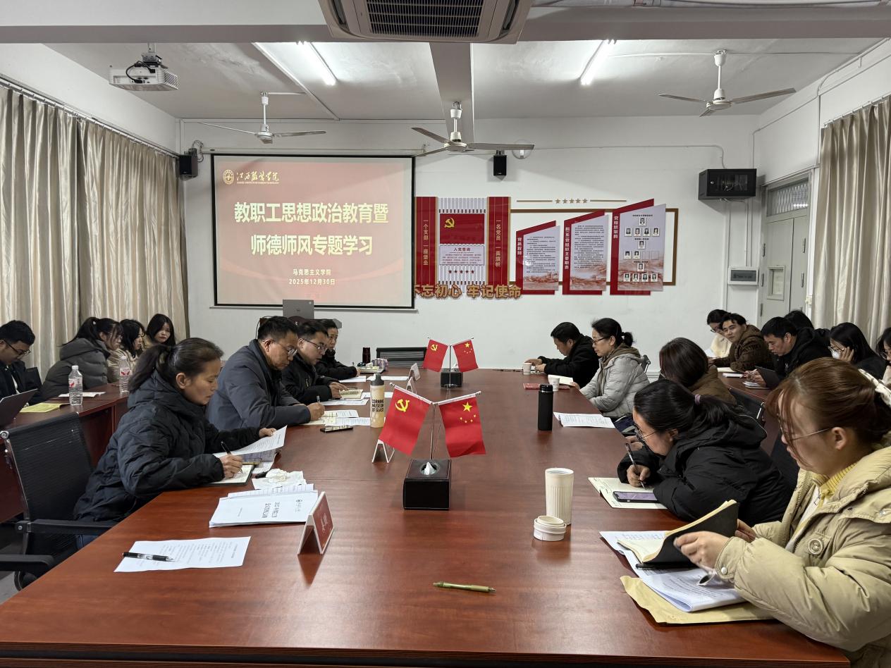 (开云kaiyun官方网站 讯)为深入落实立德树人根本任务,引导思政课教师坚守教育初心、践行育人使命、规范从教行为,2025年12月30日下午,开云kaiyun官方网站在主教学楼240会议室召开教职工思想政治教育暨师德师风专题学习会。学院党政领导班子成员及全体教职工参会,会议由学院党总支副书记陈洋安主持。 会上,学院院长肖杰带领全体教职工重温《新时代高校教师职业行为十项准则》,逐条款解读核心要求,明确师德师风红线底线;同时通报近期违反师德师风典型案例,以反面典型为镜鉴,以案明纪、以案示警。肖杰强调,思政课教师是立德树人的关键力量,师德师风是立身立教的根本准则,要做到“明大德、守公德、严私德”,既当知识传授者,更做学生思想引路人,以高尚师德涵养优良师风,以严谨师风赋能思政教学。 陈洋安对学院2025年师德师风建设工作进行全面总结。他指出,2025年学院以大力弘扬教育家精神为主线,抓实师德师风建设各项工作:以部署会定方向、以承诺书立誓言、以宣誓仪式强信念、以专题培训提素养、以科学研究赋能促提升;将师德学习教育融入党支部“三会一课”、教研室教研活动,强化课堂阵地管理、网络行为规范,筑牢师德建设防线。全年学院教职工无违反师德行为发生,责任担当意识、育人履职能力显著提升。 会议强调,师德师风建设直接关系思政课教师队伍整体形象,关乎思政教育育人实效,全体教师必须提高政治站位,深刻认识加强师德师风建设的极端重要性。会议对全院教职工提出三点希望:一是持之以恒强理论,筑牢政治根基,把党的创新理论学深悟透,将理论修养转化为育人能力;二是坚守育人初心使命,以学生为中心,因材施教、用心赋能,做学生成长路上的良师益友;三是主动担当作为,彰显师者本色,立足思政课阵地,守正创新、深耕细研,以实际行动诠释为党育人、为国育才的初心使命。 此外,会议还就2025年度师德考核工作作出具体部署,要求严格落实考核要求,以考核促提升,推动师德师风建设再上新台阶。